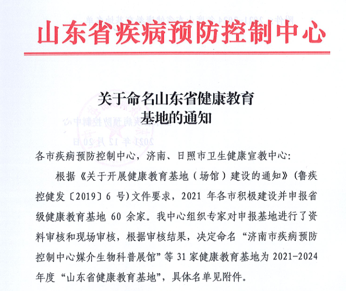 2021年12月,博物馆通过了山东省疾病预防控制中心的现场审核验收,被正式命名为2021-2024年度山东省健康教育基地。