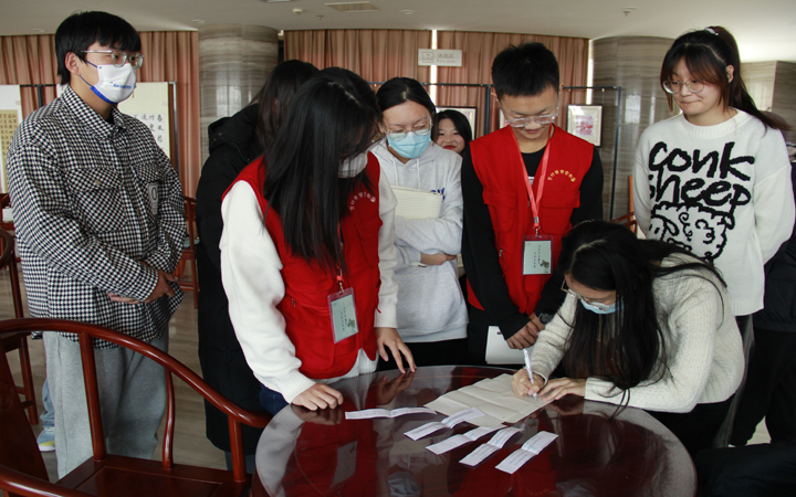 第五届杏林青春宣教团面向全体2022级新生纳新,初选由5个系部11个专业的40名同学组成。通过以师带教、老带新的“C+P”模式进行为期三个周的培训。入团选拔由笔试与讲解考核两大部分组成,笔试部分设置了考核题库,由考生随机抽取5道作为考核内容。讲解考核则根据学生的专业不同,侧重点也不相同。考核内容主要包括对于博物馆基本情况的了解程度、五大系列展览所包含的重点展品的熟悉程度、以及对各展馆讲解的熟练程度等等。