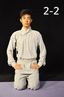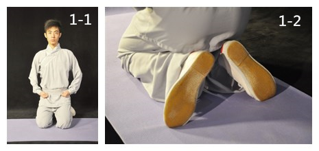 双膝着席,足跟相对,足趾向外,臀部坐于足跟上。上身保持正直,双手握固。置于大腿根部(图1-1、1-2)