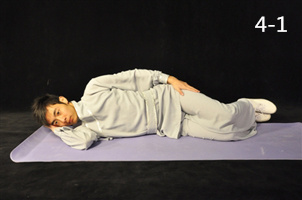 动作1:接第三节,从俯卧位转至右侧卧位,右手置于耳下,左手自然置于大腿侧面(图4-1)。
