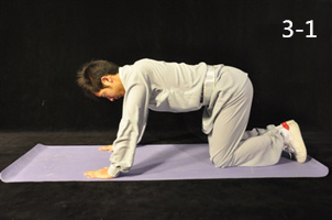 动作1:接第二节,双手沿大腿及坐席,手贴坐席前推,引躯干前行,继而伸膝,至大腿约略与坐具垂直,双手与肩等宽,固着于席,与躯干约略垂直(3-1)