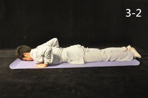 动作3~4,反复操作3~5次,回至俯卧位,双手松置体侧,掌心向上(图3-4)。