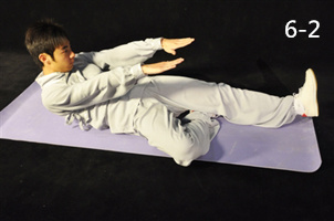 动作2:左足五趾用力背伸,带动左踝关节用力屈曲的同时,双肘关节伸直,双手间距比肩略宽,手带头走,引动腰屈曲,上半身慢慢离开坐席,稍停(图6-2)。