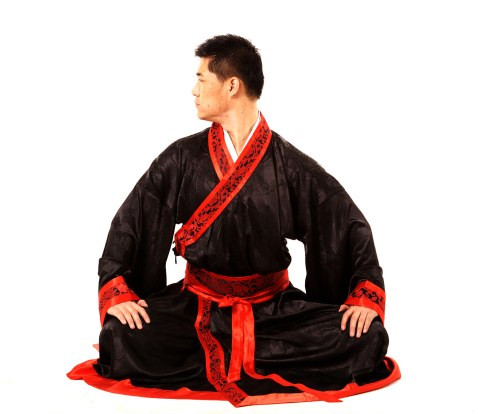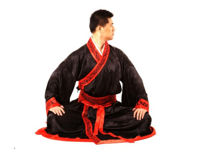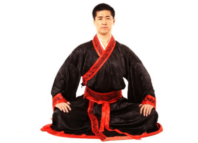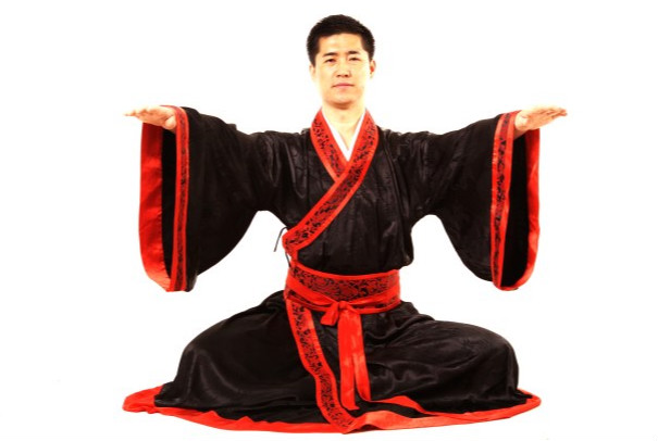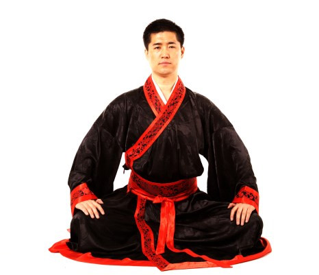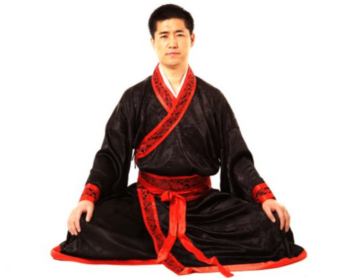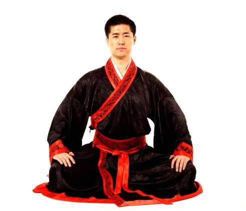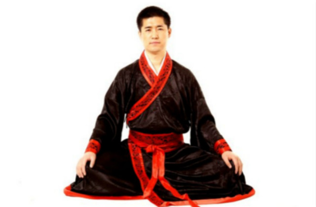 1.采用盘坐式,两手自然覆按于两膝,正身端坐,呼吸均匀,思想安静,全身放松。(图1)